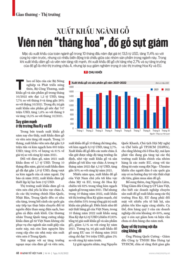 Mặc dù xuất khẩu của toàn ngành gỗ trong 10 tháng đầu năm đạt giá trị 13,5 tỷ USD, tăng 11,4% so với cùng kỳ năm trước, nhưng có nhiều biến động trái chiều giữa các nhóm sản phẩm trong ngành này. Trong khi xuất khẩu dăm gỗ và viên nén tăng rất mạnh, thì xuất khẩu đồ gỗ chỉ tăng nhẹ 2,7% và sự tăng trưởng của đồ gỗ là nhờ thị trường châu Á, nhưng lại suy giảm nghiêm trọng ở các thị trường Hoa Kỳ và EU…